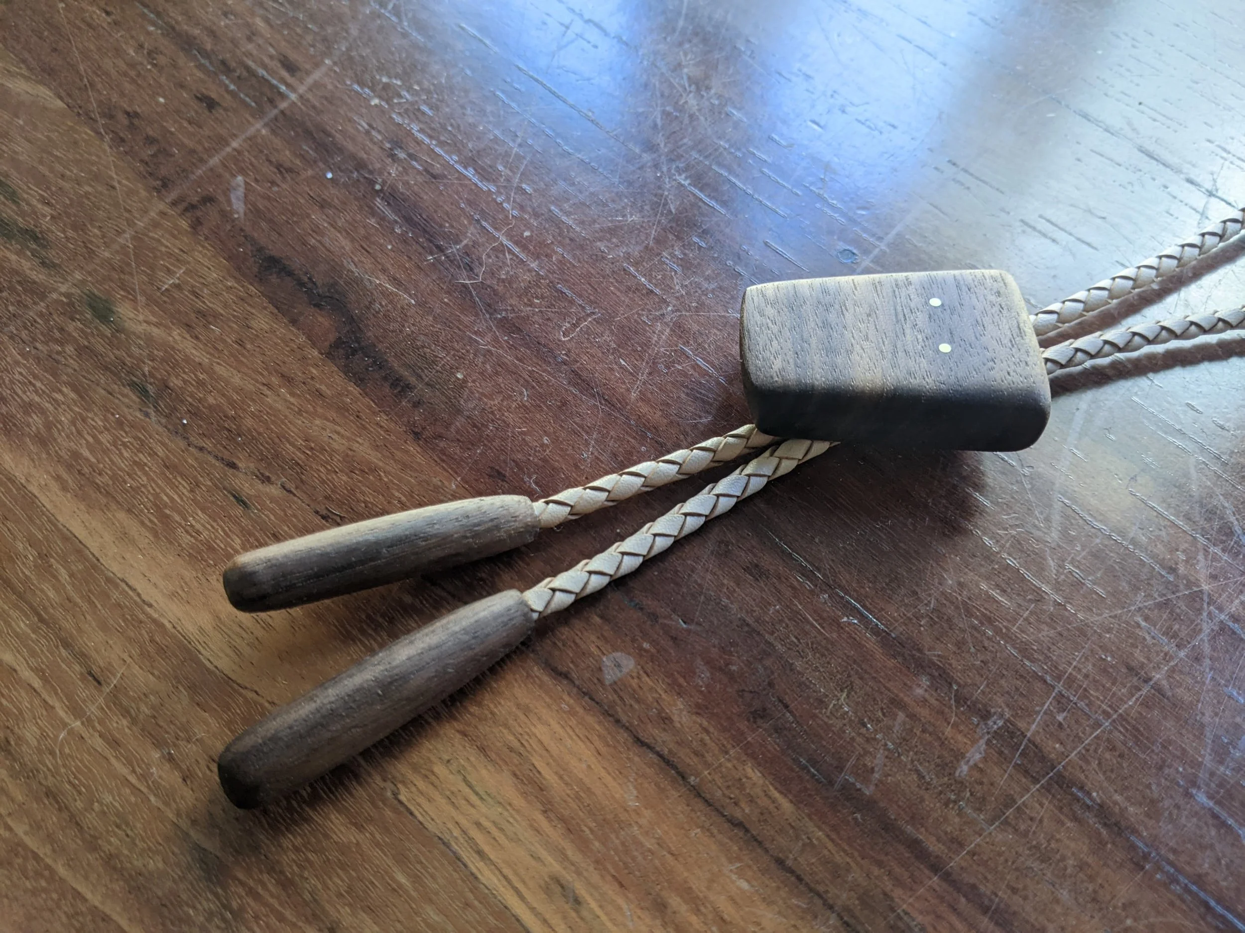 walnut (tie & end caps). natural leather cord. exposed brass joinery.